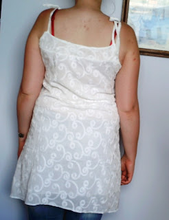 Mon amie Liliane m'a apporté des tissus et dans le lot, il y avait un joli morceau de blanc avec de belles impressions. J' ai cousu une tunique à bretelles pour ma fille. Je l'ai doublé et voilà un vêtement qui demande à ce que le soleil vienne !